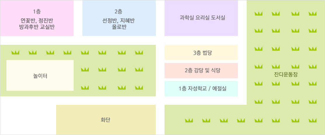 관행유치원은 1600평의 넓은 잔디운동장(축구장, 농구장) 및 실외 놀이터, 야외 수영장 시설,